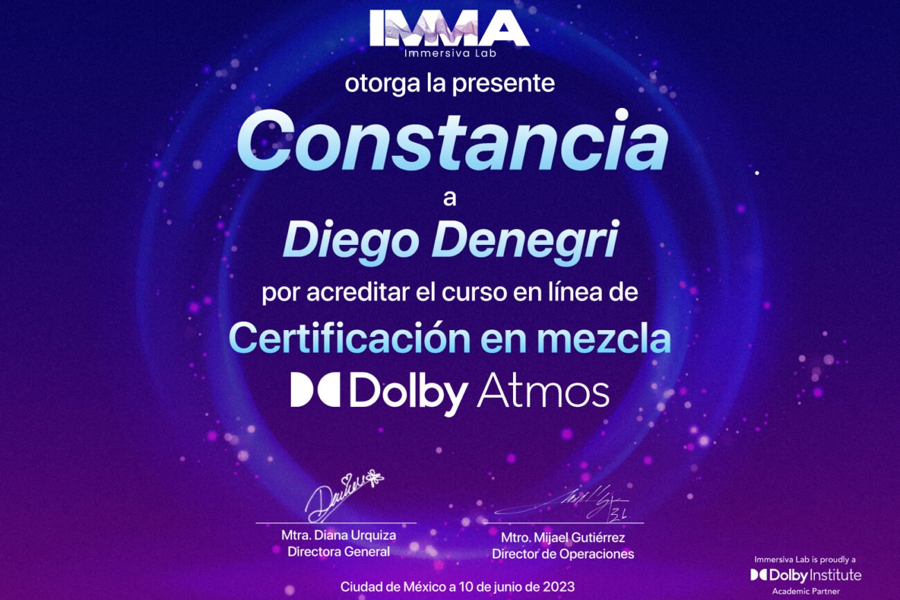 A finales del 2023 realicé la certificación en mezcla para Dolby Atmos de la mano de Andres Mayo y Martín Muscatello en la Ciudad de Buenos Aires, Argentina.